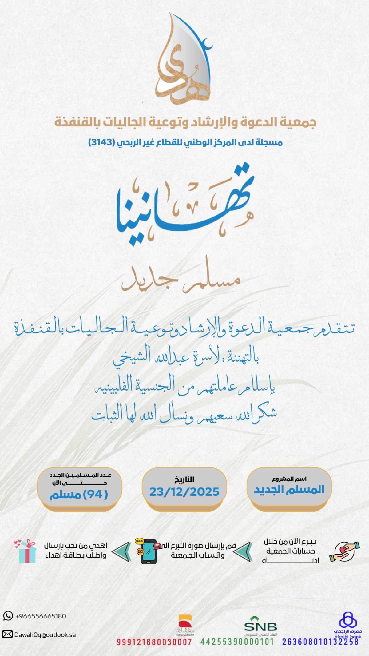 تتقدم جمعية الدعوة و الارشاد وتوعية الجاليات بالقنفذة